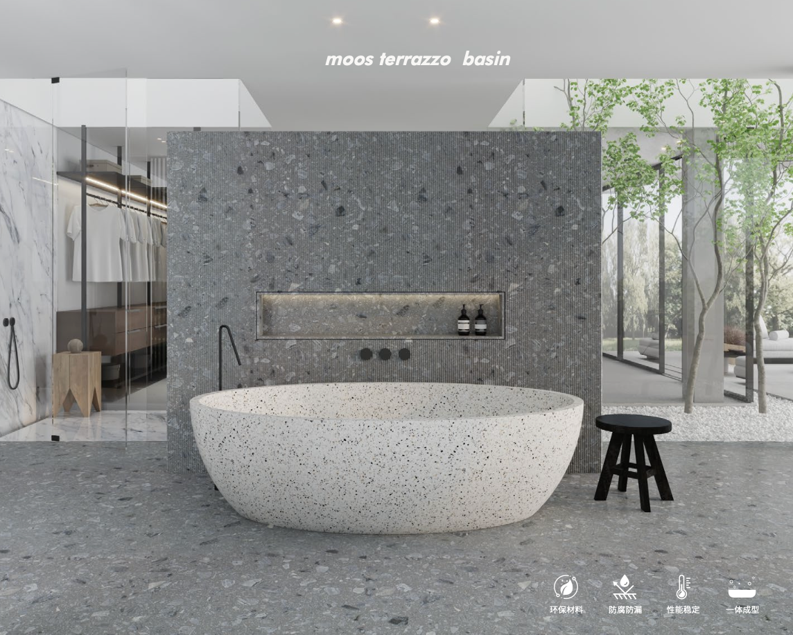 This terrazzo freestanding bathtub is a refined statement of modern architecture and natural material beauty. Crafted from premium terrazzo, its light stone tone is accented with subtle speckled aggregates, creating a clean yet textured surface that adds depth and sophistication to contemporary bathroom spaces.